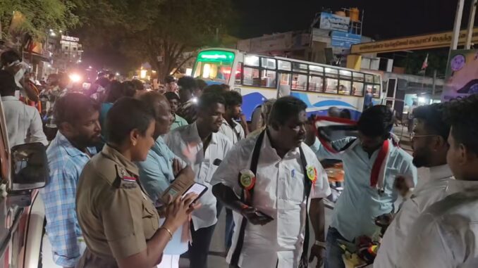 ஆனால் கூட்டம் நடைபெற உள்ள இடத்திற்கு வந்த காவல்துறையினர், அந்த பகுதியில் பேண்ட் செட் மற்றும் ஒலிபெருக்கி போன்ற சாதனங்களை பயன்படுத்தக் கூடாது என்று கட்டுப்பாடுகளை விதித்தனர். இதனால் அங்கு இருந்த கட்சித் தொண்டர்கள் மற்றும் நிர்வாகிகள் இடையே பரபரப்பு ஏற்பட்டது. கூட்டத்திற்கு தேவையான அனுமதியை தேர்தல் ஆணையத்திடம் முறையாக பெற்று இருந்தோம் என்றும், இருந்த போதிலும் காவல்துறையினர் தேவையற்ற கெடுபிடி செய்து வருகின்றனர் என்றும் அவர்கள் குற்றம் சாட்டினர்.