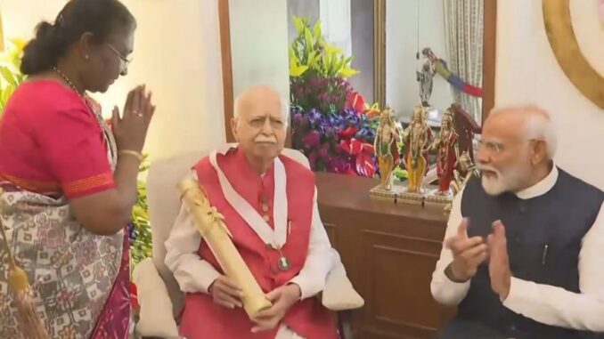 தொடர்ந்து வயதுமூப்பு காரணமாக அத்வானிக்கு வீடு தேடிச் சென்று பாரத ரத்னா விருது வழங்கப்படுவதாக தகவல் வெளியானது. அதன்படி டெல்லியில் உள்ள அத்வானி வீட்டுக்குச் சென்று குடியரசுத்தலைவர் திரவுபதி முர்மு அவருக்கு பாரத ரத்னா விருதை வழங்கினார். அப்போது பிரதமர் நரேந்திர மோடி, குடியரசு துணைத்தலைவர் ஜெக்தீப் தன்கர், முன்னாள் குடியரசு துணைத்தலைவர் வெங்கையா நாயுடு ஆகியோர் உடனிருந்தனர்.