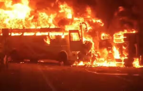 ஆந்திரப் பிரதேசத்தின் பிரகாசம் மாவட்டத்தில் உள்ள மார்க்கபுரம் மண்டலத்தின் ராயவரம் அருகே இன்று அதிகாலை தனியார் சொகுசு பஸ் ஒன்று கற்கள் ஏற்றிச் சென்ற லாரியுடன் நேருக்கு நேர் மோதி விபத்துக்குள்ளானது. பிறகு மோதிய வேகத்தில் பஸ்சும், லாரியும் மளமளவென தீப்பற்றி எரிய தொடங்கியது. தகவல் அறிந்து சம்பவ இடத்திற்கு தீயணைப்பு படையினர் விரைந்தனர். இந்த சம்பவத்தில் 10 பேர் தீயில் உடல் கருகி உயிரிழந்தனர்.
