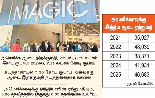 அமெரிக்க ஆடை இறக்குமதி, 2023ல், 6.69 லட்சம் கோடி ரூபாய்; 2024ல், 7.11 லட்சம் கோடி ரூபாய் கடந்தாண்டில் 7.35 கோடி ரூபாய் அளவுக்கு ஆடை இறக்குமதி நடந்துள்ளதாக தகவல் அமெரிக்காவுக்கு இந்தியாவின் ஏற்றுமதியும், 5.90 சதவீதத்தில் இருந்து 6.30 சதவீதமாக உயர்வு.