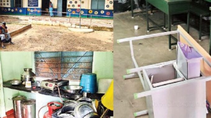 இரவில் பள்ளிக்கு வந்த மர்ம நபர்கள், பள்ளியின் பூட்டை உடைத்து, சமையல் கூடத்தின் பூட்டை உடைத்து உள்ளே நுழைந்தனர். அங்கு சாகவாசமாக அமர்ந்து மது அருந்தியதோடு, சத்துணவு முட்டைகளை சைட் டிஷ்ஷாக சாப்பிட்டுள்ளனர்.போதை தலைக்கேறியதும் அருகே உள்ள வகுப்பறையில் நுழைந்து சேர்களை உடைத்ததோடு, ஸ்மார்ட் கிளாஸ் ப்ரொஜெக்டர் ஹார்ட் டிஸ்கையும் திருடி சென்றுள்ளனர்.