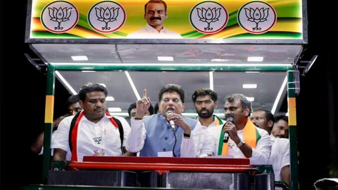 தமிழக சட்டசபை தேர்தல் வருகிற 23-ந் தேதி நடைபெற இருக்கிறது. தேர்தலில் பதிவாகும் வாக்குகளின் எண்ணிக்கை அடுத்த மாதம் (மே) 4-ந் தேதி நடைபெற உள்ளது. அவிநாசி சட்டமன்றத் தொகுதியில் தேர்தல் பிரசாரங்கள் தீவிரமாக நடைபெற்று வரும் நிலையில், அவிநாசி மேற்கு ஒன்றியத்திற்குட்பட்ட பகுதிகளான கருவலூர் மற்றும் தெக்கலூர் போன்ற பகுதிகளைச் சேர்ந்த பொதுமக்களைச் சந்தித்து, தேசிய ஜனநாயக கூட்டணி கட்சியின் வேட்பாளராக போட்டியிடும் மத்திய இணை-மந்திரி எல். முருகன் அவர்களை ஆதரித்து, மத்திய வர்த்தக மற்றும் தொழில்துறை மந்திரியும், தமிழக பாஜக தேர்தல் பொறுப்பாளருமான பியூஷ் கோயல் தாமரை சின்னத்தில் வாக்கு சேகரித்தார்.