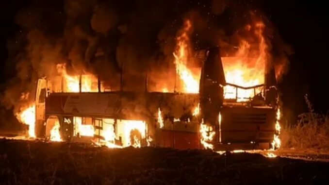 ஆந்திராவின் மர்க்காபுரம் பகுதியில் தனியார் பஸ் -டிப்பர் லாரி நேருக்கு மோதி விபத்துக்குள்ளாகின. மோதிய வேகத்தில் பஸ் தீ பிடித்து எரிந்தது. அதிகாலை நேரம் என்பதால் பல பயணிகள் தூக்கத்தில் இருந்தனர். இதனால் அவர்களால் உடனடியாக வெளியே வர முடியவில்லை . விபத்து பற்றி தகவல் அறிந்தவுடன் தீயணைப்பு வீரர்கள், போலீசார் விரைந்து வந்து தீயை அணைத்து மீட்பு பணியை மேற்கொண்டனர்.