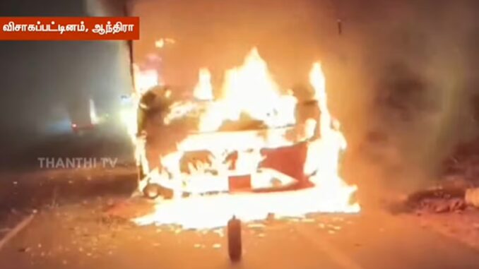 ஒடிசா மாநிலம் புவனேஸ்வரில் இருந்து ஆந்திர மாநிலம் மங்கல்கிரி நோக்கி தனியார் ஆம்னி பேருந்து சென்று கொண்டிருந்தது. அந்த பேருந்து விசாகப்பட்டினம் அருகே உள்ள தாராபுரம் பகுதியில் சென்று கொண்டிருந்தபோது, அதன் பின் பக்க டயர் எதிர்பாராதவிதமாக வெடித்துச் சிதறியுள்ளது.