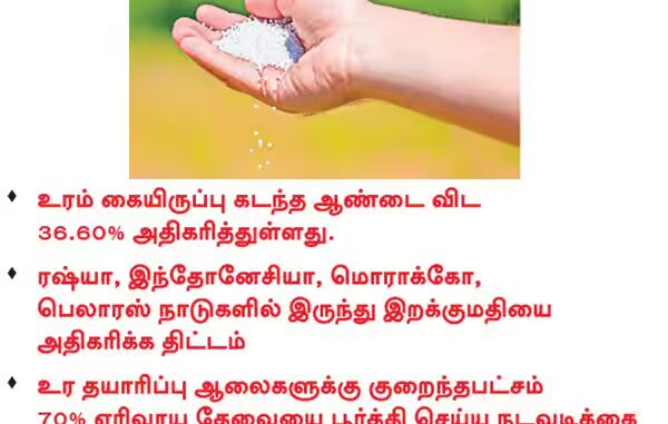 யூரியா கையிருப்பு: 61.51 லட்சம் டன் இதுவரை இறக்குமதி 98 லட்சம் டன் எதிர்பார்க்கப்படும் இறக்குமதி 17 லட்சம் டன் மொத்த உர கையிருப்பு: 180.12 லட்சம் டன் கடந்த ஆண்டு 131.79 லட்சம் டன் 36.60% அதிகம்.