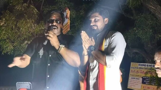இப்பொழுது அப்படி இல்லை வாக்குப்பதிவு இயந்திரத்தில் பட்டனை அழுத்த வேண்டும். அதில் ஏழாவது எண் கொண்ட விசில் சின்னத்திற்கு நீங்கள் வாக்களிக்க வேண்டும். அந்த பட்டனை நீங்கள் அமுக்கினீர்கள் என்றால் ஆலங்குளம் தொகுதி அருமையான தொகுதி என்று பெயர் வாங்கும். தமிழ்நாட்டிலேயே முதன்மையான தொகுதியாக ஆலங்குளம் தொகுதி ஆக்குவோம் என்று சொல்கிறார்கள். ஆலங்குளம் சிறிது களங்களாக இருக்கும் அல்லவா அந்த களங்களை நீக்கி தெளிவான ஆழமான குளமாக மாற்றக்கூடிய வல்லமை படைத்தவர் விபின் சக்கரவர்த்தி” என்று பேசினார்.