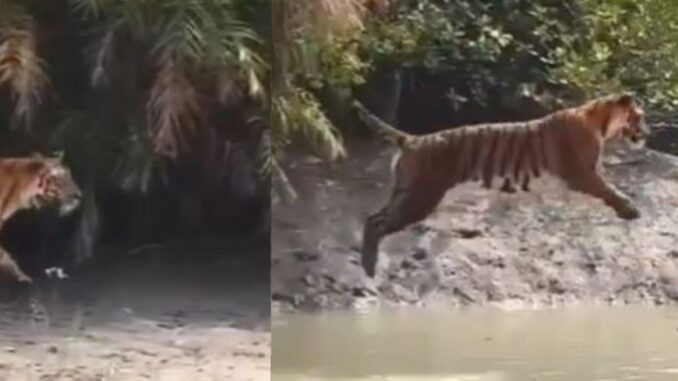 புலி ஒன்று நதிக்கரையை லாங் ஜம்ப் அடித்து தாண்டும் காட்சிகள் சமூகவலைதளங்களில் வைரலாகி வருகிறது. முன்னதாக, புகைப்பட கலைஞரான ஹர்சல் மல்வான்கர், மகாராஷ்டிரா மாநிலம் தடோபா தேசிய பூங்காவில் இந்த காட்சிகளை பதிவுசெய்தார். அதைத் தொடர்ந்து, இந்திய ரயில்வே துறை அதிகாரியான அனந்த் ரூபனாகுடி இதனை பகிர்ந்த நிலையில், காட்டுத்தீ போல இந்த காட்சிகள் பரவி வருகிறது.