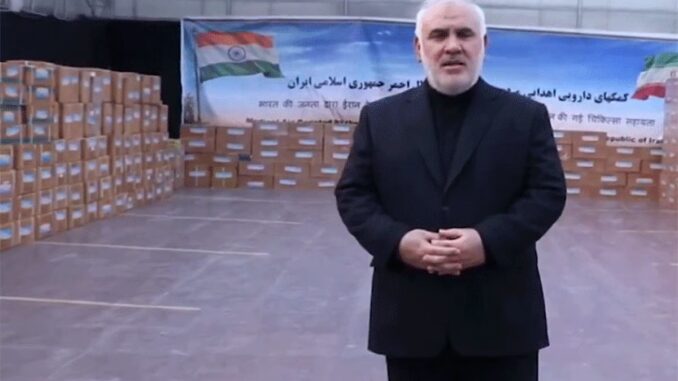 ஈரான் தூதரகம் இந்திய மக்களிடமிருந்து பெறப்பட்ட தன்னார்வ நன்கொடைகளை கொண்டு 40 டன் மருந்துகளை வாங்கியுள்ளது. அந்த மருந்துகள் கடந்த மாதம் 18-ம் தேதி அன்று முதல் தொகுப்பு அனுப்பி வைக்கப்பட்டது. தற்போது இன்று இந்தியாவில் இருந்து மருந்துகள் அடங்கிய இரண்டாவது தொகுப்பு ஈரானிய செம்பிறை சங்கத்திற்கு (Red Crescent Society) அனுப்பி வைக்கப்பட்டுள்ளது.