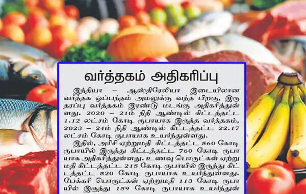 வர்த்தகம் அதிகரிப்பு இந்தியா – ஆஸ்திரேலியா இடையிலான வர்த்தக ஒப்பந்தம் அமலுக்கு வந்த பிறகு, இரு தரப்பு வர்த்தகம் இரண்டு மடங்கு அதிகரித்துள்ளது. 2020 – 21ம் நிதி ஆண்டில் கிட்டத்தட்ட 1.12 லட்சம் கோடி ரூபாயாக இருந்த வர்த்தகம், 2023 – 24ம் நிதி ஆண்டில் கிட்டத்தட்ட 22.17 லட்சம் கோடி ரூபாயாக உயர்ந்துள்ளது. இதில், அரிசி ஏற்றுமதி கிட்டத்தட்ட 560 கோடி ரூபாயில் இருந்து கிட்டத்தட்ட 760 கோடி ரூபாயாக அதிகரித்துள்ளது. உணவு பொருட்கள் ஏற்றுமதி கிட்டத்தட்ட 215 கோடி ரூபாயில் இருந்து கிட்டத்தட்ட 520 கோடி ரூபாயாக உயர்ந்துள்ளது. பேக்கரி பொருட்கள் ஏற்றுமதி 113 கோடி ரூபாயில் இருந்து 159 கோடி ரூபாயாக உயர்ந்துள்ளது.