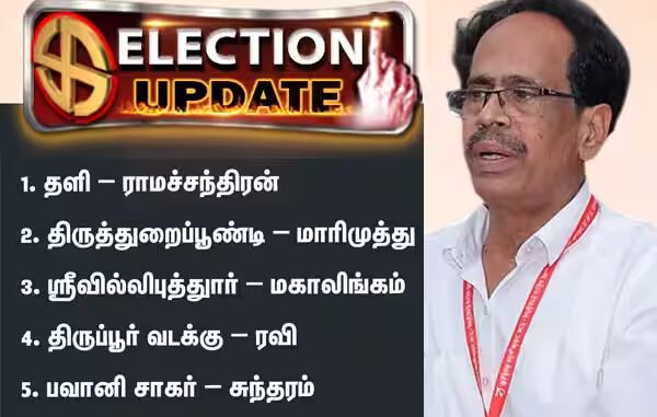 சட்டசபை தேர்தலில், தி.மு.க., கூட்டணி கட்சிகள் போட்டியிடும் தொகுதிகள் பட்டியல் வெளியானது. இதனால் வேட்பாளர்களை கூட்டணி கட்சியினர் வெளியிட்டு வருகின்றனர். அந்த வகையில் போட்டியிடும் 5 தொகுதிகளுக்கான வேட்பாளர்கள் பட்டியலை இந்திய கம்யூனிஸ்ட் வெளியிட்டது.