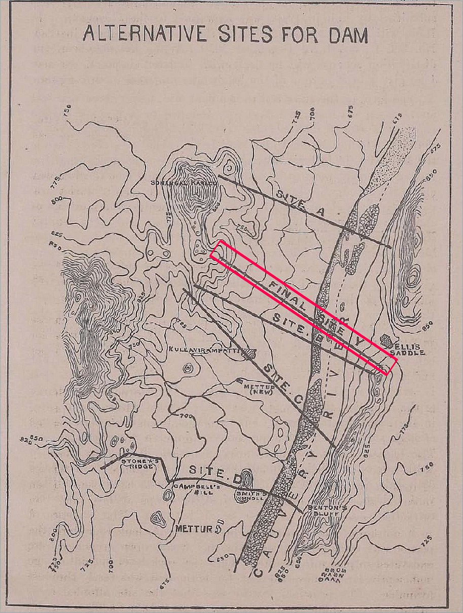 அந்த நேரத்தில் புவியியலாளர்கள் டாக்டர் ஸ்மீத் மற்றும் விநாயக ராவ் மேட்டூருக்கு வந்து ஆய்வு செய்து, “Site-D” வலுவற்றது என்று அதிர்ச்சி அறிக்கையை அளித்தனர். அதே சமயம், C.G. பார்பர் மற்றும் ஸ்டோனி ஆய்வு செய்து கண்டு வைத்திருந்த “SITE-Y” என்ற பகுதி புவியியல் ரீதியாக சிறந்ததாக தெரியவந்தது. அங்கு அஸ்திவாரம் குறைந்த ஆழத்தில் கிடைக்க, பாறைகள் வலிமையாகவும் விரிவாகவும் பரவியிருந்தன. இதனால் “SITE-D” சோதனைகள் நிறுத்தப்பட்டு, “SITE-Y”-யில் கவனம் திருப்பப்பட்டது.
