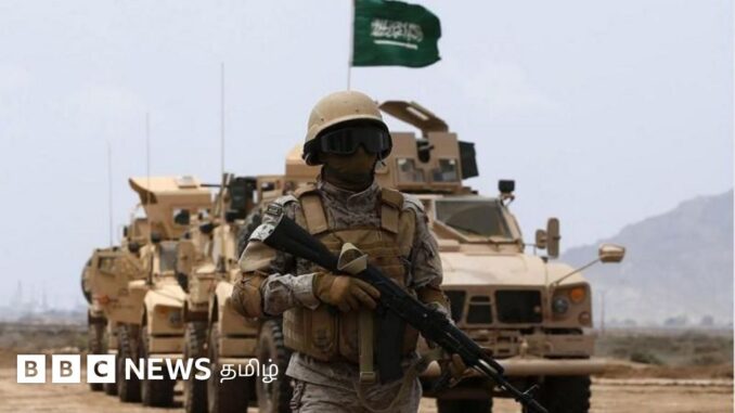 படக்குறிப்பு, சௌதி அரேபிய வீரர்கள் போர் டாங்கிகளுடன் பயிற்சி செய்கிறார்கள்25 மார்ச் 2026