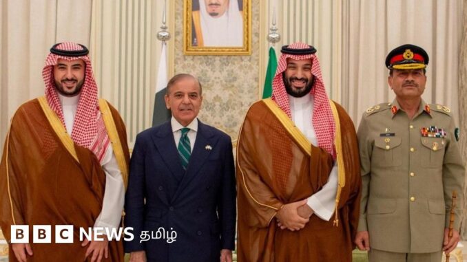 படக்குறிப்பு, கடந்த 2025-ஆம் ஆண்டு செப்டம்பர் மாதம் பாகிஸ்தான் மற்றும் சௌதி அரேபியா ‘கூட்டு உத்தி சார் பாதுகாப்பு ஒப்பந்தத்தில்’ கையெழுத்திட்டது.12 ஏப்ரல் 2026, 04:31 GMT