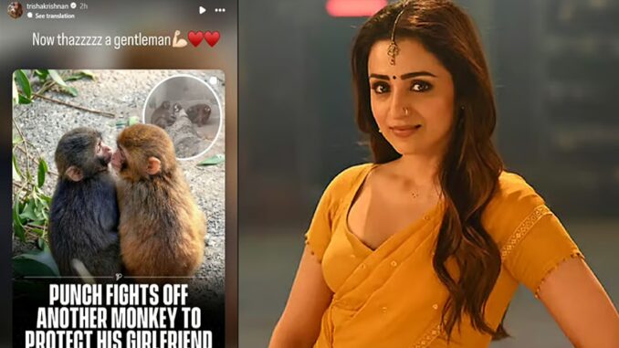 இந்நிலையில் நடிகை திரிஷா இன்ஸ்டா ஸ்டோரி பதிவு வைரலாகியுள்ளது. ‘பன்ச்’ குரங்குக்கு புது தோழி கிடைத்திருக்கும் நிலையில், அதை காப்பாற்ற மற்றொரு குரங்குடன் ‘பன்ச்’ சண்டை போட்ட லேட்டஸ்ட் வீடியோவுக்கு தான் திரிஷா கமெண்ட் செய்து இருக்கிறார். அதில் “Now that’s a gentleman 💪❤️” என்று கமெண்ட் செய்துள்ளார்.