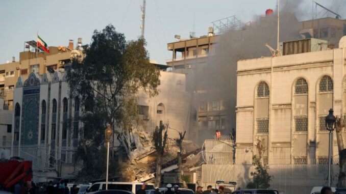 இஸ்ரேலின் F-35 போர் விமானங்கள் ஈரான் தூதரக கட்டிடத்தின் மீது 6 ஏவுகணைகளை வீசியதாக, சிரியாவுக்கான ஈரான் தூதர் ஹோசைன் அக்பரி கூறியுள்ளார். தாக்குதலில் சேதமடைந்த கட்டிடத்தின் இடிபாடுகளில் சிக்கியவர்களை மீட்கும் பணிகள் தற்போது நடைபெற்று வருவதாக தெரிவிக்கப்பட்டுள்ளது.