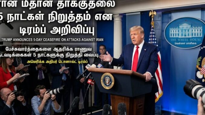தற்போது நடைபெற்று வரும் பேச்சுவார்த்தைகளின் சுமுகமான போக்கைக் கருத்தில் கொண்டு, ஈரானின் மின் நிலையங்கள் மற்றும் எரிசக்தி உள்கட்டமைப்புகள் மீது நடத்தத் திட்டமிடப்பட்டிருந்த ராணுவத் தாக்குதல்களை ஐந்து நாட்களுக்குத் தள்ளிவைக்க அதிபர் டிரம்ப் உத்தரவிட்டுள்ளார். இந்தத் தற்காலிகத் தாக்குதல் நிறுத்தம் என்பது தற்போது நடைபெற்று வரும் பேச்சுவார்த்தைகளின் வெற்றியைப் பொறுத்தே அமையும் என்றும் அவர் தெளிவுபடுத்தியுள்ளார்.
