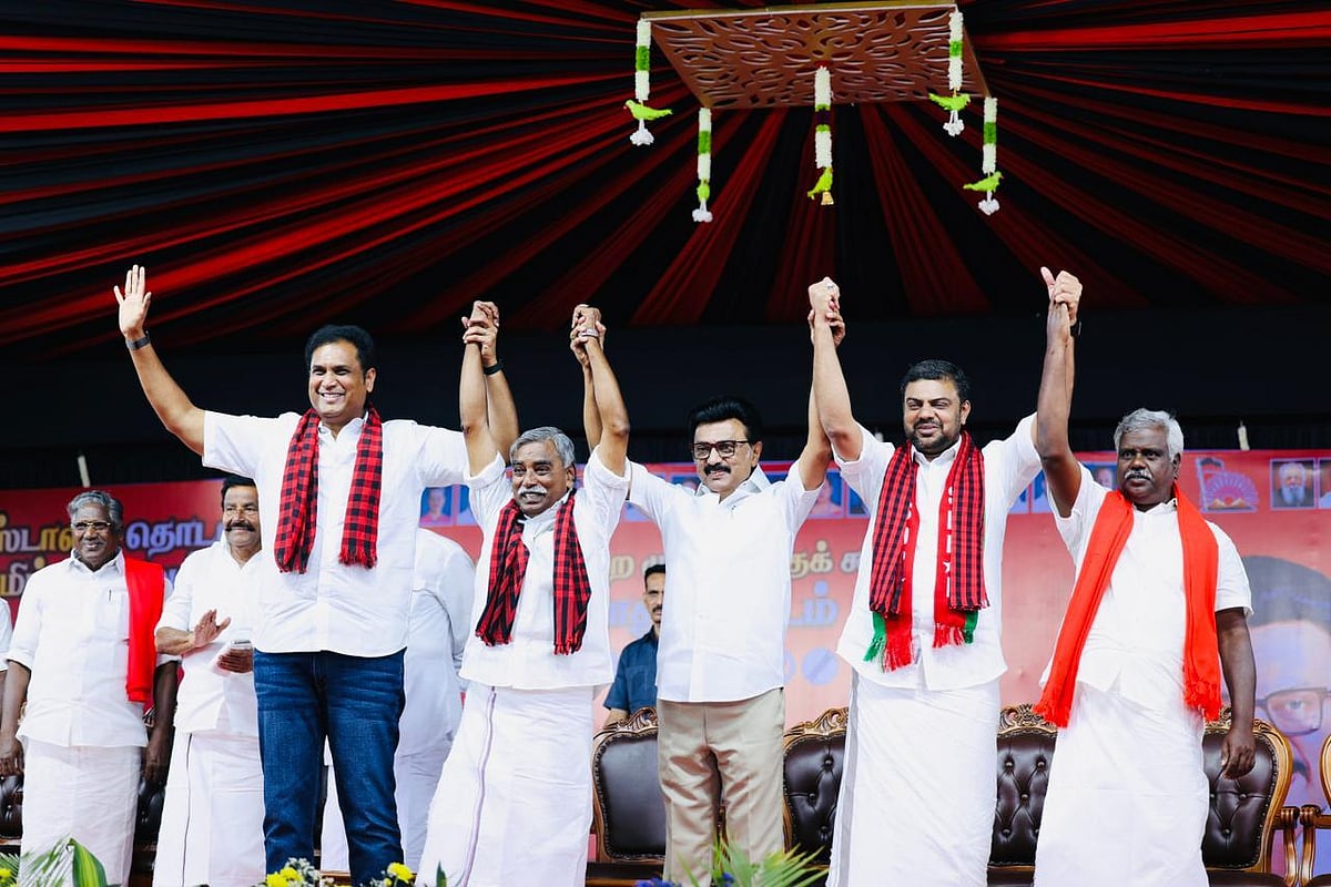 அதனாலதான் சொன்னேன், இந்தத் தேர்தல் என்பது தமிழ்நாடு அணி வெர்சஸ் டெல்லி அணி. தமிழ்நாடு வெர்சஸ் என்.டி.ஏ. தமிழ்நாட்டைக் காக்கணும்னா தி.மு.க. தான் மீண்டும் ஆட்சிக்கு வரணும். தமிழ்நாடு வளர்ச்சிப் பாதையில தொடர்ந்து நடைபோடணும்னா, திமுக ஆட்சியில தொடரணும். தமிழ்நாடு கலவர பூமியாக மாறாமல் இருக்கணும்னா, பா.ஜ.க – அ.தி.மு.க கூட்டணியை வேரோடு வீழ்த்தணும். நீங்க எல்லாரும் ஒரு விஷயத்தை நல்லா புரிஞ்சுக்கணும். நாம் போராடுறது தி.மு.க-வோட வெற்றிக்காக மட்டும் அல்ல, தி.மு.க தலைமையில அமைந்திருக்கக்கூடிய கூட்டணிக் கட்சிகளின் வெற்றிக்காக மட்டும் அல்ல, இது தமிழ்நாட்டோட வெற்றி, மறந்துடாதீங்க. தமிழ்நாட்டிற்கான வெற்றி இது.