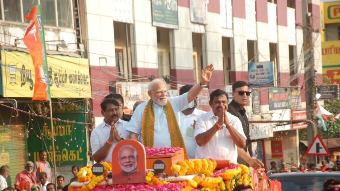 அ.தி.மு.க மற்றும் பா.ஜ.க கூட்டணி கட்சி சார்பில் கன்னியாகுமரி, திருநெல்வேலி, தூத்துக்குடி, தென்காசி மாவட்டத்தில் போட்டியிடும் வேட்பாளர்களை ஆதரித்து பிரதமர் நரேந்திர மோடி நாகர்கோவிலில் ரோடு ஷோ நடத்தி பிரசாரம் மேற்கொண்டார். ஹெலிகாப்டர் மூலம் நாகர்கோவில் வந்த பிரதமர் மோடி, ஹெலி பேட் தளத்தில் இருந்து காரில் நாகர்கோவில் வேப்பமூடு சந்திப்பு சென்றார். வேப்பமூடு சந்திப்பில் அமைக்கப்பட்டிருந்த காமராஜர் படத்துக்கு மலர்தூவி மரியாதை செலுத்திய மோடி பின்னர் ரோடு ஷோவைத் தொடங்கினார். சாலையின் இருபுறமும் பிரதமர் மோடியை பார்க்க காத்திருந்த மக்கள் ரோஜா மலர்களைத் தூவி வரவேற்றனர். வாகனத்தில் பிரதமர் நரேந்திர மோடியுடன், தமிழக எதிர்கட்சி தலைவர் எடப்பாடி பழனிசாமி, பா.ஜ.க மாநிலத் தலைவர் நயினார் நாகேந்திரன், முன்னாள் மாநிலத் தலைவர் அண்ணாமலை, பொன்.ராதாகிருஷ்ணன் ஆகியோர் மோடியுடன் நின்றவாறே மக்களைப் பார்த்து கையசைத்து வாக்கு சேகரித்தனர். வேப்பமூடு சந்திப்பில் தொடங்கிய ரோட் ஷோ-வின்போது வழியில் அம்பேத்கர் உருவபடத்துக்கும், அண்ணா மற்றும் எம்.ஜி.ஆர் படத்துக்கும் மலர் தூவி மரியாதை செலுத்தினார் பிரதமர் மோடி.