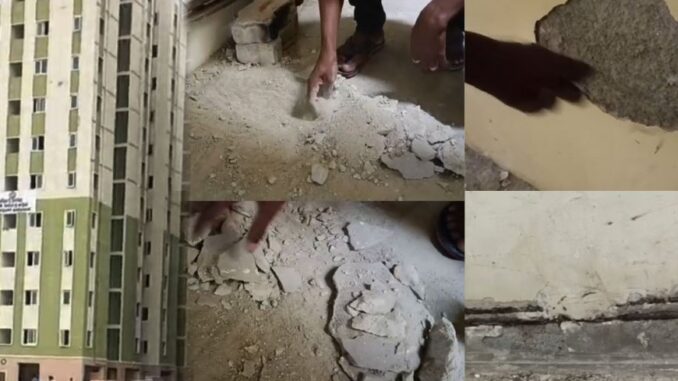 இவ்வாறிருக்க, தற்போது பெய்த கனமழைக்கு பிறகு கட்டடத்தில் மழைநீர் தேங்கி உள்ளதாக அங்கு வசிக்கும் மக்கள் குற்றம்சாட்டினர். அதோடு, ‘மாவீரன்’ படத்தில் வருவது போல் சுவற்றை சுரண்டினால் சிமெண்ட் கலவை கையோடு வருவதாகவும் தரை ஓட்டையாக உள்ளதாகவும் அடுக்கடுக்காக குற்றச்சாட்டுகளை கூறினர்.