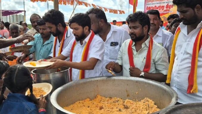 தமிழக வெற்றிக் கழகம் முதல் மாநில மாநாடு நடைபெறவுள்ள நிலையில் சென்னை அருகே தவெக சார்பில் 25 அடி உயர கொடி கம்பத்தில் கட்சி கொடியேற்றி, ஏழை எளிய மக்களுக்கு அன்னதானம் வழங்கினார்கள்.