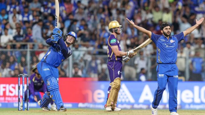 இன்று நடைபெற்ற ஆட்டத்தில் மும்பை – கொல்கத்தா அணிகள் மோதின. இதில் டாஸ் வென்ற மும்பை அணி பந்துவீச்சை தேர்வு செய்தது. அதன்படி முதலில் பேட்டிங் செய்த கொல்கத்தா அணி அதிரடியாக விளையாடி ரன்கள் குவித்தது.