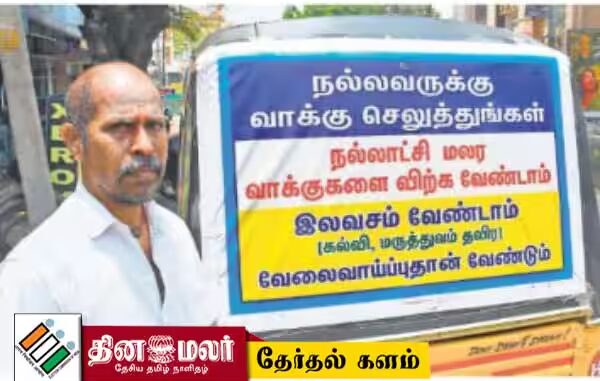 திண்டுக்கல், ஈ.பி., காலனியைச் சேர்ந்தவர் முருகன், 47. கடந்த 30 ஆண்டுகளாக ஆட்டோ ஓட்டி வருகிறார். தன் ஆட்டோவின் பின்பகுதியில், ‘கல்வி, மருத்துவம் தவிர இலவசம் வேண்டாம்; வேலைவாய்ப்பு தான் வேண்டும். நல்லாட்சி மலர ஓட்டுகளை விற்க வேண்டாம்’ என அச்சடிக்கப்பட்ட பிளக்ஸ் பேனரை கட்டி வைத்து விழிப்புணர்வு ஏற்படுத்தி வருகிறார்.