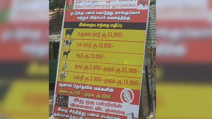 அந்த வகையில், திருவாடானை தொகுதியில் உள்ள புதுப்பட்டிணம் கிராமத்தில், நாம் தமிழர் கட்சி சார்பில் விழிப்புணர்வு வாசகம் அடங்கிய பேனர் வைக்கப்பட்டுள்ளது. அதில், “ஓட்டுக்கு பணம் கொடுத்து வாங்குவோர் மற்றும் விற்போர் கவனத்திற்கு… இன்றைய சந்தை மதிப்பு, எருமை மாடு ரூ.55 ஆயிரம், பசு மாடு ரூ.45 ஆயிரம், ஆடு ரூ.10 ஆயிரம், நாய் ரூ.5 ஆயிரம் முதல் ரூ.25 ஆயிரம் வரை, பன்றி ரூ.5 ஆயிரம் முதல் ரூ.15 ஆயிரம் வரை.