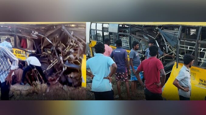 கரூர் மாவட்டம் தாந்தோணி வட்டத்தில் தனியார் கல்லூரி உள்ளது. இந்த கல்லூரியை சேர்ந்த மாணவர்கள் இன்று மாலை கல்லூரி பஸ்சில் வீடு திரும்பிக்கொண்டிருந்தனர்.