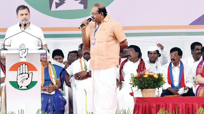 கோயில் நிலம் கொள்ளை: மக்களிடம் மட்டுமல்ல, ஆண்டவனிடமும் கொள்ளை அடித்துள்ளனர். கோயில் நிலங்கள் கொள்ளையடிக்கப்பட்டுள்ளது. சட்ட ஒழுங்கு சீர்குலைந்துள்ளது. இரவில், பெண்கள், குழந்தைகள் நடமாட முடியவில்லை. பள்ளி, கல்லுாரிகளில் போதைப்பொருட்கள் பயன்படுத்தப்படுகிறது. இதுகுறித்து ஆளுநருக்கு தெரிந்தும் நடவடிக்கை எடுக்கவில்லை. புதுவை மக்களின் உண்மையான குரலை ஒலிக்கும் அரசை, இந்த சட்டப்பேரவைத் தேர்தலில் தேர்வு செய்யுங்கள்.இவ்வாறு ராகுல் பேசினார்.