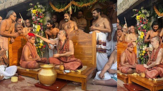இந்த நிலையில் இன்று காலை காஞ்சிபுரம் காமாட்சி அம்மன் கோவிலில் உள்ள பஞ்சகங்கா குளத்தில் காஞ்சி சங்கராச்சாரியார் விஜயேந்திர சரஸ்வதி சுவாமிகள்,கணேச ஷர்மா திராவிட்டுக்கு சன்யாச தீஷை வழங்கி இளைய மடாதிபதியாக நியமித்து ஆசி வழங்கினார். மேலும், இளையமடாதிபதிக்கு ’ஸ்ரீ சத்திய சந்திரசேகரேந்திர சரஸ்வதி சுவாமிகள்’ என்று நாமம் சூட்டப்பட்டது. அதனை தொடர்ந்து இரண்டு சங்கராச்சாரியார்களும் திருக்குளத்தில் இருந்து ஒன்றாக வந்து காமாட்சியம்மனை தரிசனம் மேற்கொண்டனர். அதனைதொடர்ந்து சங்கரமடம் அமைந்துள்ள சாலை தெரு பகுதிக்கு இருவரும் ஊர்வலமாக வருகைதந்து சங்கரமடத்தில் அவருக்கு பதவி பிரமாணம் என்று சொல்லப்படக்கூடிய பட்டாபிஷேகம் நடைபெற்றது.