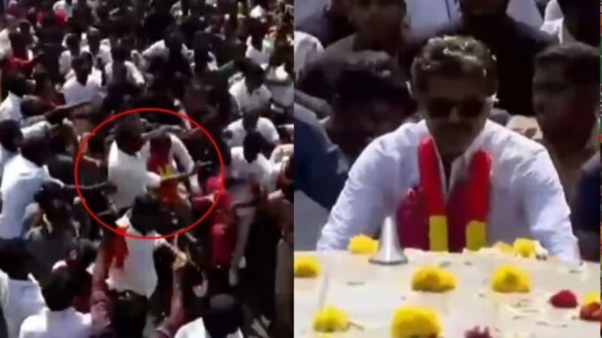 இந்த நிலையில், காரைக்குடி நகருக்குள் பிரச்சார வாகனத்தில் சென்றபோது, கட்டுக்கடங்காத மக்கள் கூட்டத்தால் வாகனம் நகர முடியாமல் ஸ்தம்பித்தது. இதனால், கூட்டத்தை கடந்து செல்வதற்காக விஜய் திடீரென தனது வாகனத்திலிருந்து இறங்கி சைக்கிளில் பயணிக்கத் தொடங்கினார். விஜய் சைக்கிளில் செல்வதைக் கண்ட ரசிகர்கள் அவரைச் சூழ்ந்து கொண்டனர். அப்போது ஏற்பட்ட நெரிசலில், சைக்கிளில் இருந்து இறங்கி மீண்டும் பிரச்சார வாகனத்தில் ஏற முயன்றபோது விஜய் நிலைதடுமாறி விழச் சென்றார். இதனைக் கண்டு அதிர்ச்சி அடைந்த பவுன்சர்கள் உடனடியாக அருகிலிருந்த அவரைப் பிடித்து மீட்டனர்.பின்னர் மீண்டும் வாகனத்தில் ஏறி பயணம் செய்தார்.