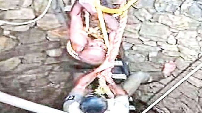 அதிர்ஷ்டவசமாக அங்கிருந்த மோட்டார் பம்புசெட் மற்றும் கயிற்றை பிடித்துக்கொண்டு உயிருக்கு போராடியபடி உதவிக்கு கூச்சலிட்டார். ஆனால், ஆள் நடமாட்டம் இல்லாததால் 3 நாட்க ளாக உணவின்றி கிணற்றுக்குள்ளேயே பரிதவித்தார்.