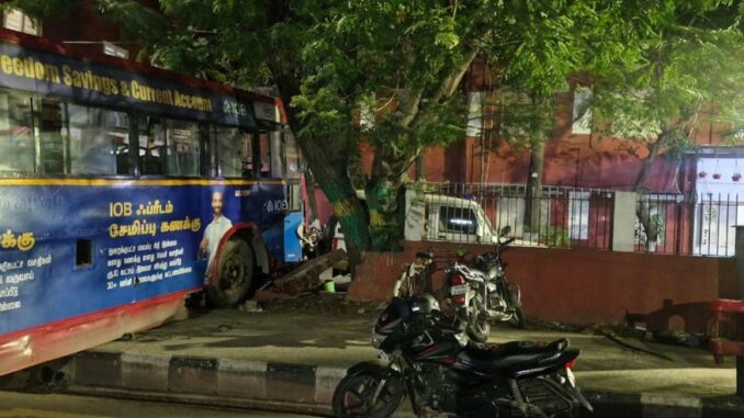 சென்னையில் குடிபோதையில் பேருந்தை இயக்கி காவல் நிலைய காம்பவுண்டில் மோதிய மெக்கானிக்கால் பரபரப்பு ஏற்பட்டது.