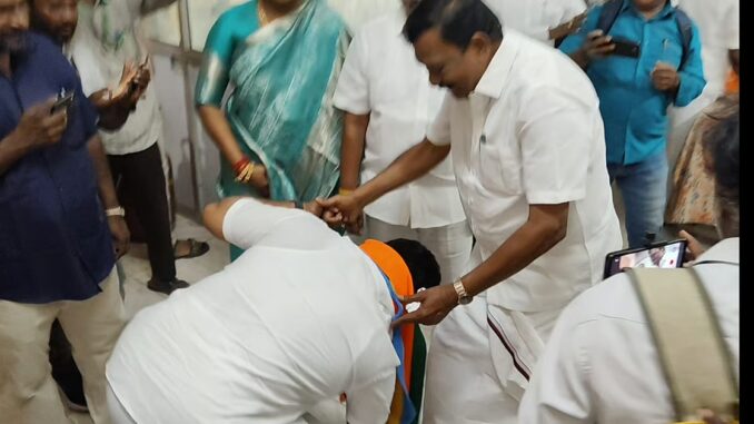பதிலுக்கு கோவிந்தராஜனும் வணக்கம் செலுத்தியபோது திடீரென சுதாகர், தி.மு.க வேட்பாளர் கோவிந்தராஜனின் காலில் விழுந்து `அண்ணே என்னை ஆசீர்வாதம் பண்ணுங்க’ எனக் கூறினார். அதனால் பதறிப் போன கோவிந்தராஜன், அவசர அவசரமாக சுதாகரரை தூக்கி விட்டுவிட்டு அங்கிருந்து சென்றார்.