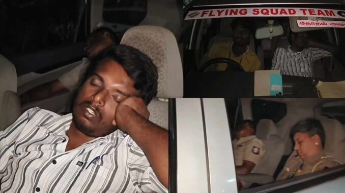 இந்நிலையில் திருப்பத்தூர் மாவட்டத்தில் இரவு நேர கண்காணிப்பு பணியில் அமர்த்தப்பட்ட தேர்தல் பறக்கும் படை அதிகாரிகள் காரை ஒரு புறத்தில் ஓரமாக நிறுத்திவிட்டு உறங்கிக் கொண்டிருந்ததாக வீடியோ காட்சி ஒன்று இணையத்தில் வைரலாகி வருகிறது. உறங்கிக் கொண்டிருந்த நிலையில் செல்போனில் வீடியோ எடுப்பதை அறிந்து தூக்கத்திலிருந்து எழுந்த அதிகாரி வீடியோ எடுக்க வேண்டாம் என சைகை காட்டும் வீடியோ காட்சிகள் தற்போது இணையத்தில் வைரல் ஆகி வருகிறது. இதுதொடர்பாக அதிகாரிகள் தரப்பில் எந்த விளக்கமும் கொடுக்கப்படவில்லை.