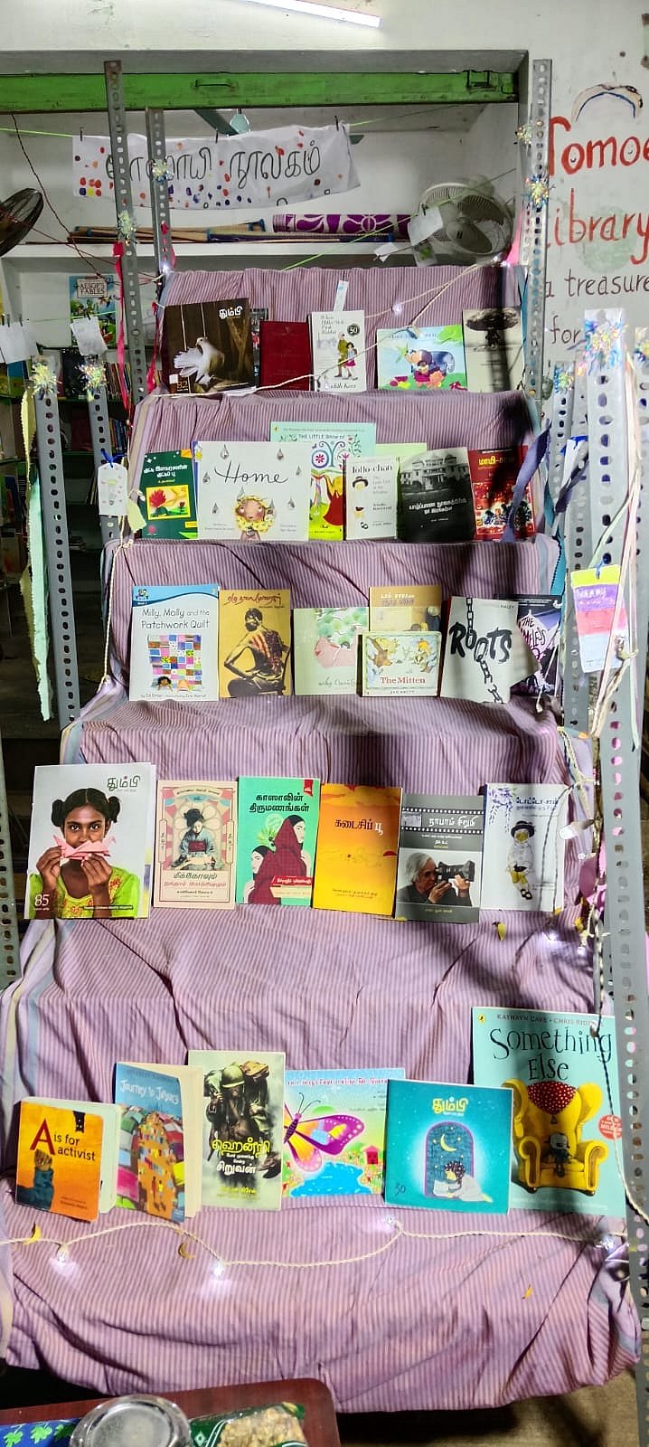 “நானும் என் கணவரும் தமிழ்நாடு சிறார் எழுத்தாளர்கள் சங்கத்தில் உறுப்பினராக இருக்கிறோம். அந்த சங்கத்தில் கூறப்படுகின்ற புது சிறார் புத்தகங்களையெல்லாம் குறித்து நூலகத்தில் வாங்கி வைப்போம். ஆரம்பத்தில் என் நண்பர்கள் சிலர் ரூ.500, 1000ரூபாய் நூலகம் அமைப்பதற்கு தந்தார்கள். பிறகு நாங்கள் மாதம் மூன்று புத்தகங்களையாவது நூலகத்திற்காக வாங்கிவிடுவோம். தற்போது எங்கள் நூலகத்தில் 1500 புத்தகங்கள் வரை இருக்கின்றன. கடந்த ஆண்டு நவராத்திரி பண்டிகையின்போது ஒன்பது நாட்களும் நாங்கள் புத்தகங்களைக் கொண்டு எங்கள் நூலகத்தில் கொலு அமைத்தோம். மாணவர்கள் விரும்பி வந்து சிறார் பாடல்கள் பாடினார்கள். ஒன்பது நாட்களும் ஒவ்வொரு தலைப்பிலும் புத்தகங்களைக் கொண்டு கொலு அமைத்தோம். மாணவர்களும் விரும்பி வாசித்தார்கள். இவ்வாறு என் மகள் 7 வயதில் ஒரு முறை நாளிதழைப் பார்த்து, “அம்மா இவர்கள் பொம்மைகளால் கொலு வைத்திருக்கிறார்கள்” என்றாள். அவள் இதுவரை கண்டது புத்தகங்களாலான கொலுவையே பார்த்திருக்கிறாள். எனவே அவள் பொம்மைகளுடனான கொலுவைப் பார்த்து ஆச்சரியமாக என்னிடம் கேட்டது ஒரு விதத்தில் மகிழ்ச்சி தந்தது. என்னுடைய ஆசை என் மகள் போல் ஒவ்வொரு குழந்தையும் புத்தகங்களோடு பண்டிகைகளைக் கொண்டாட வேண்டும். அப்போது வீட்டிலேயே ஒரு நூலகம் உருவாகிவிடும்.”