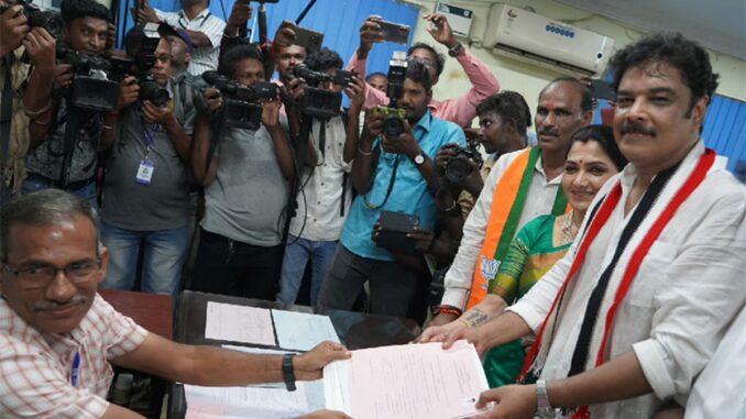 அ.தி.மு.க. – பா.ஜ.க. கூட்டணியில் ஏ.சி.சண்முகத்தின் புதிய நீதிக் கட்சிக்கு 2 தொகுதிகள் ஒதுக்கப்பட்டன. இதில் மதுரை மத்திய தொகுதி வேட்பாளராக இயக்குநர் சுந்தர்.சி அறிவிக்கப்பட்டார். அவர் இன்று வேட்பு மனு தாக்கல் செய்தார். வேட்பு மனு தாக்கலின்போது சுந்தர்.சியின் மனைவி குஷ்புவும் உடன் இருந்தார்.