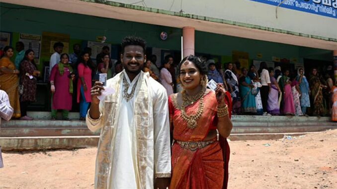 கேரளாவில் சட்டசபை தேர்தலுக்கான வாக்குப்பதிவு நடைபெற்று வருகிறது. இந்த நிலையில், மாநிலத்தின் பத்தினம்திட்டா மாவட்டத்தில் ஒரு புதுமண தம்பதிகளான திவ்யஸ்ரீ மற்றும் அஷ்வந்த், திருமணம் முடிந்த கையோடு, நேரடியாக வாக்குச்சாவடிக்கு சென்று தங்களது வாக்கை பதிவுசெய்தனர்.