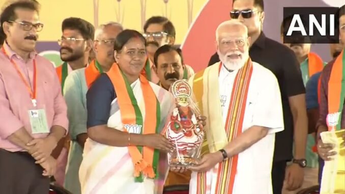 இந்நிலையில், கேரளாவின் பாலக்காட்டுக்கு வருகை தந்த அவருக்கு கட்சியினர் சிறப்பான வரவேற்பு கொடுத்தனர். பிரதமர் மோடி, கேரளாவின் பாரம்பரிய உடையான முண்டு எனப்படும் வேட்டி அணிந்து மேடையில் தோன்றினார். அவருக்கு, சால்வை போர்த்தி, கேரளாவின் சிறப்பு வாய்ந்த பொருட்களை கட்சியினர் அன்பளிப்பாக வழங்கினர். அதனுடன் பிரதமர் மோடி, கேரளாவின் பிரசித்தி பெற்ற செண்டை மேளம் இசைத்து மகிழ்ச்சியை வெளிப்படுத்தினார். இதனை தொடர்ந்து அவர் கூட்டத்தில் உரையாற்றி வருகிறார்.