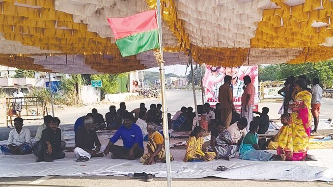சாலையின் நடுவே பந்தல் அமைத்து அங்கேயே தூங்கி எழுந்து போராட்டம் நடத்தி வருகின்றனர்.