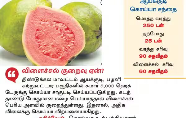 கொய்யாப்பழ விளைச்சல் 60 சதவீதம் சரிந்துள்ளதாகவும், திண்டுக்கல் மாவட்டம் ஆயக்குடி சந்தையில் 1 கிலோ கொய்யா 125 ரூபாயாக உயர்ந்துள்ளதாகவும், ஆயக்குடி கொய்யா உற்பத்தியாளர்கள் தெரிவித்துள்ளனர்.