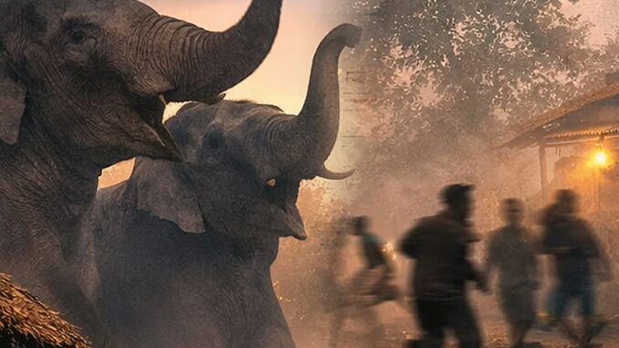 இதற்கிடையில், வனத்துறையினர் பட்டாசுகளை வெடித்து யானைகளை விரட்டியபோது, ஒரு யானை ஆக்ரோஷமடைந்து அதிகாரிகளை துரத்தியது. அந்த யானையிடம் இருந்து தப்பிக்க அதிகாரிகள் ஒரு வீட்டிற்குள் தஞ்சம் புகுந்தனர்.