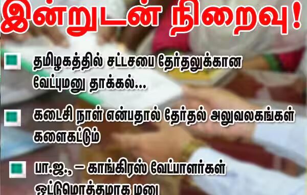 சென்னை:தமிழக சட்டசபை தேர்தலுக்கான வேட்பு மனு தாக்கல் இன்றுடன் நிறைவு பெறுகிறது. கடைசி நாளான இன்று, பா.ஜ., – காங்கிரஸ் வேட்பாளர்கள் ஒட்டுமொத்தமாக மனு தாக்கல் செய்ய உள்ளதால், தேர்தல் அலுவலகங்கள் களைகட்டும் என எதிர்பார்க்கப்படுகிறது.