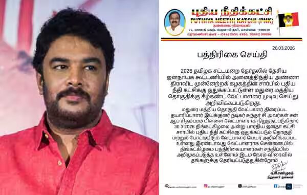 இது தொடர்பாக புதிய நீதி கட்சி தலைவர் ஏ.சி. சண்முகம் வெளியிட்டுள்ள அறிக்கை: 2026ம் ஆண்டு சட்டசபை தேர்தலில், தேசிய ஜனநாயகக் கூட்டணியில் அதிமுக சார்பில் புதிய நீதிக் கட்சிக்கு ஒதுக்கப்பட்டுள்ள மதுரை மத்திய தொகுதியில் திரைப்பட தயாரிப்பாளரும், இயக்குநரும், நடிகருமான சுந்தர் சி வேட்பாளராக நிறுத்தப்படுகிறார். இதை அறிவிப்பதில் மகிழ்ச்சி அடைகிறேன்.