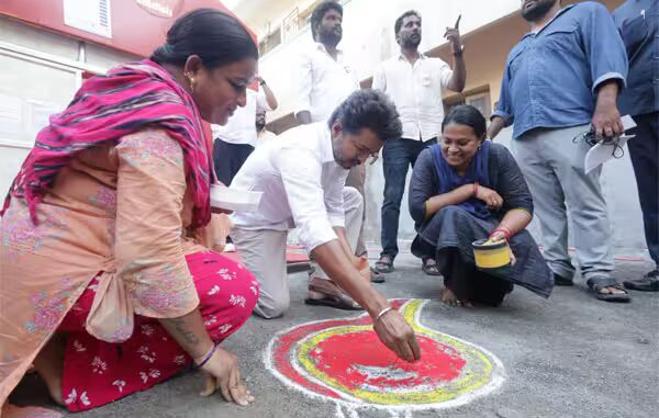 இந்நிலையில் விஜய், இன்று மாலை தான் போட்டியிடும் பெரம்பூர் தொகுதிக்கு சென்றார். அங்கு வீடு வீடாக சென்று ஓட்டு சேகரித்த விஜய், விசில் கோலம் போட்டார். அங்கு அமைக்கப்பட்டு இருந்த தவெக பணிமனையிலும் வீசில் சின்னத்தை கோலமாக வரைந்தார்.