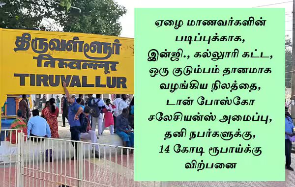 கடந்த 2013ல், திருவள்ளூர் மாவட்டம், பண்ணுாரில் உள்ள ஒரு குடும்பம், இன்ஜி., கல்லுாரி அமைப்பதற்காக, டான் போஸ்கோ சலேசியன்ஸ் அமைப்பிற்கு தானமாக வழங்கிய நிலத்தை, தனிநபருக்கு விற்றுள்ளனர். இதற்கு, டான்போஸ்கோ சலேசியன்ஸ் தலைமை பதில் அளிக்க வேண்டும்.