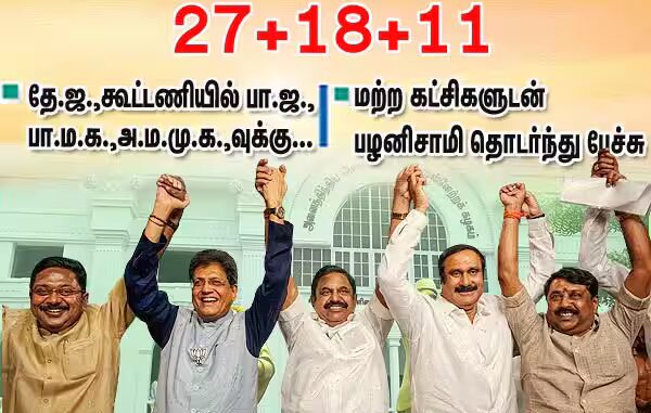 சென்னை: தே.ஜ., கூட்டணியில், பா.ஜ.,வுக்கு 27, பா.ம.க.,வுக்கு 18, அ.ம.மு.க.,வுக்கு 11 தொகுதிகளை அ.தி.மு.க., ஒதுக்கியுள்ளது. த.மா.கா.,