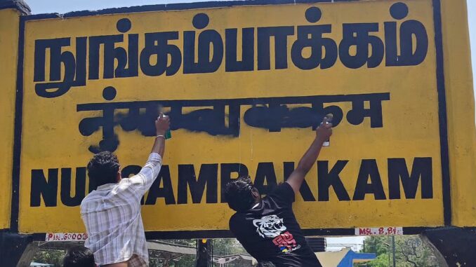 போராட்டத்தின் இரண்டாம் நாளான இன்று சென்னை ரயில்வேயின் குரோம்பேட்டை, நுங்கம்பாக்கம் ரயில் நிலையங்களில் உள்ள இந்தி பெயர் எழுத்துகள் மே17 இயக்கத் தோழர்களால் அழிக்கப்பட்டன” என்று பதிவிட்டிருக்கிறார்.