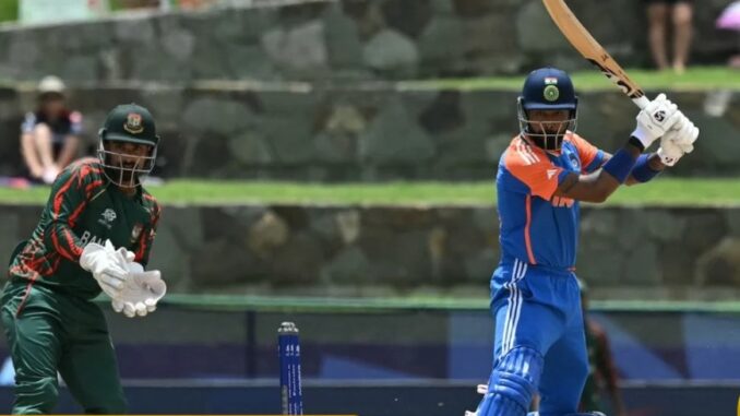 ஓரளவு சிறப்பாக விராட் கோலி 28 பந்தில் 37 ரன் எடுத்து தன்சிம் ஹசன் சாகிப் ஓவரில் ஆட்டமிழந்தார். பின்பு சூர்யகுமார் யாதவ் 6 ரன்னில் அவுட்டாகி ஏமாற்றம் அளித்தாலும், ரிஷப் பண்ட் (24 பந்தில் 36 ரன்), ஷிவம் துபே (24 பந்தில் 34 ரன்) அதிரடியாக விளையாடினார்கள்.