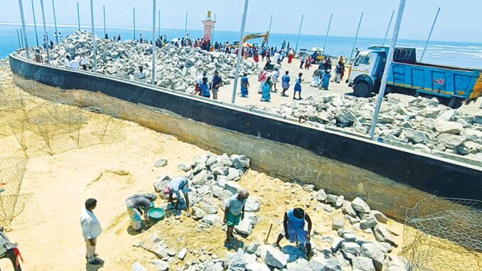 இந்நிலையில் தனுஷ்கோடி அரிச்சல் முனை சாலை வளைவை சுற்றிலும் கூடுதலாக பாறாங்கற்கள் கொட்டப்பட்டு தடுப்பு சுவர்கள் கட்டும்பணி தேசிய நெடுஞ்சா லைத்துறை மூலம் தீவிரமாக நடந்து வருகிறது. அரிச்சல் முனை சாலை வளைவில் மற்றும் கடற்கரை பகுதியில் லாரிகளில் இருந்து கொண்டு வரப்பட்டு கொட்டப்பட்டுள்ள கற்கள் பொக்லைன் எந்திரம் மூலம் தடுப்பு சுவராக அடுக்கி வைக்கப்பட்டு அந்த கற்கள் சரிந்து கீழே விழாமல் இருக்கும் வகையில் இரும்பு கம்பிகளை கொண்டு வேலிகளும் அமைக்கப்பட்டு வருகின்றன.